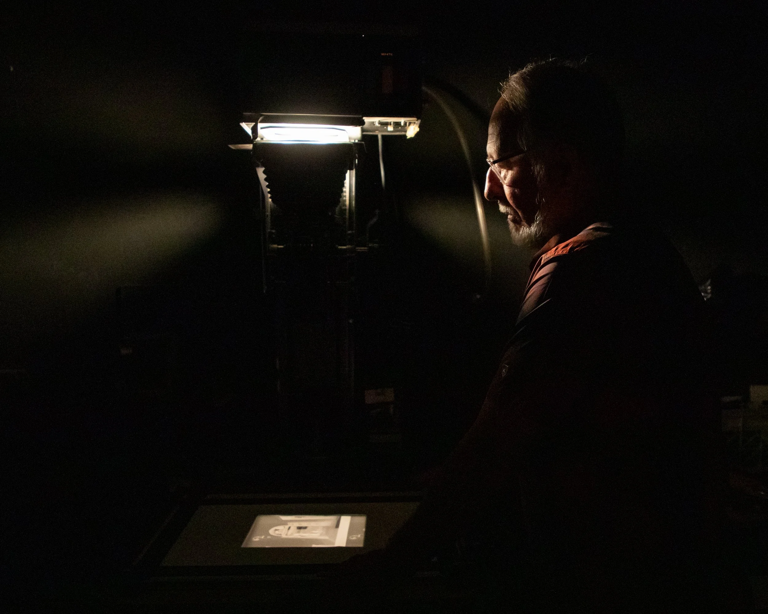 Bill Wierzalis, 74, an analog photographer, prints his work in the darkrooms at Full Circle Fine Art Services in Baltimore on Monday, July 11, 2022.